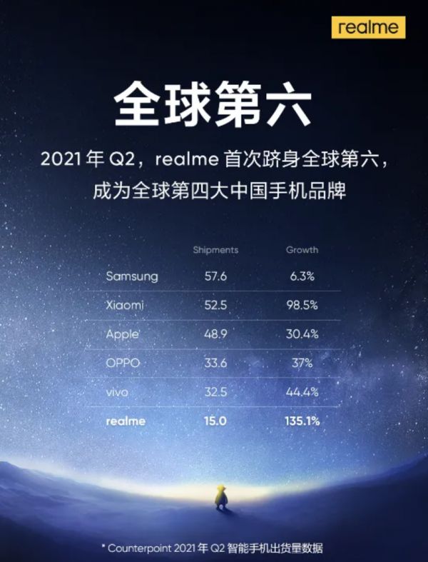 不过realme却创造了销量神话。Strategy Analytics发布的数据显示,仅三年时间,realme就成为全球最快达到1亿销量的智能手机品牌。Counterpoint数据显示,2021年Q2,realme智能手机的出货量为1500万,同比增长135.1%,位居全球第六。