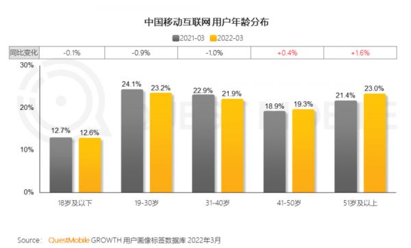 但问题是,realme年轻品牌的定位,并不能无限制的满足其产品扩张的欲望。QuestMobile发布的《2022中国移动互联网春季大报告》显示,2022年3月,中国移动互联网31岁及以上的年龄占比为64.2%,并且30岁及以下的用户占比还降低了1%。