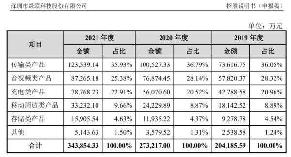 招股书透露的绿联科技收入构成中,以传统数据线为代表的传输类产品占比最高,贡献营收超过3成。2021年,绿联传输类产品营收为10.24亿元,占营收总结构的35.93%,相比2020年的36.79%份额,有少许下降。