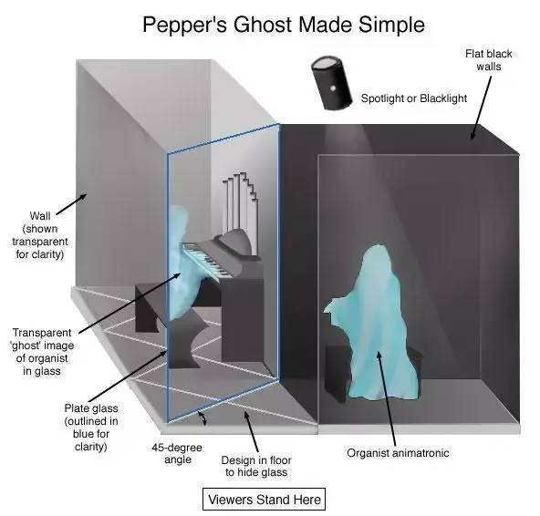 而当代有了高流明度的打光和强力的CGI技术,所以现代的佩珀尔幻象可以栩栩如生,但是原理没有发生本质上的改变。