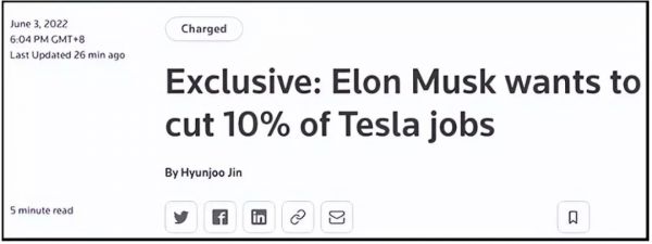 6月3日,马斯克在给发给公司高管的“暂停全球所有招聘”邮件中表示,“特斯拉需要削减约10%的岗位”。