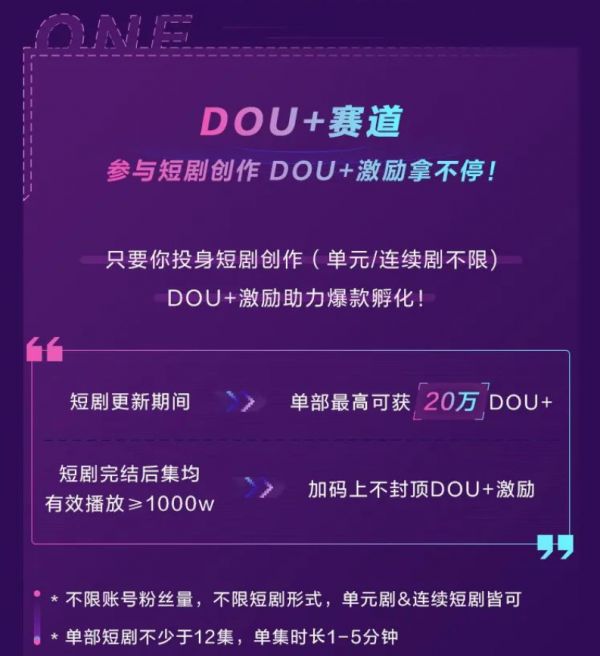 在Dou+赛道上,不限账号粉丝量,不限短剧形式,单元剧或连续短剧皆可;在分账赛道上,分账单价从每千次有效播放5元上调到了6元;在剧星赛道上,由“千万爆款剧乐部”的发布账号粉丝≥200万,下调至账号粉丝量≥100万。