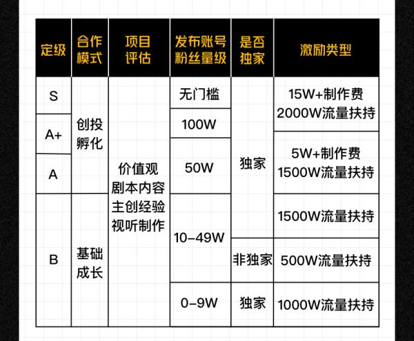 与抖音的“剧有引力计划”相比,快手更是把“无门槛”发挥到极致,针对S级内容,不设置门槛,激励类型成为了超过15万的制作费和2000万的流量扶持。当然,这种无门槛设定其实并不主要针对普通用户,相反,而是为了吸引更多专业的内容制作团队入驻快手,即便从零起步,也可以同样享受最高级别的激励类型。