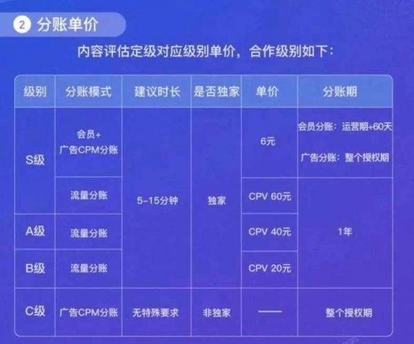 而且爱奇艺不仅下手早,更是最先打开分账模式的平台,率先确立了分账金额包含会员付费分账、广告、招商三部分,实行A、B、C 3个等级,片方提交基本信息后,平台审核定级和报审,单价为5元、3元、2元每部不等。