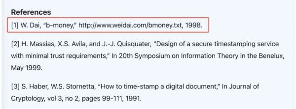 中本聪在当年撰写比特币论文的过程中,他曾多次致信Wei Dai讨论比特币,明确表示过比特币是对于B-money构想的一种补充和延展。如今,当你翻看比特币白皮书时,你会发现参考文献的第一条也就是来自于Wei Dai于1998年发布的“B-Money”。
