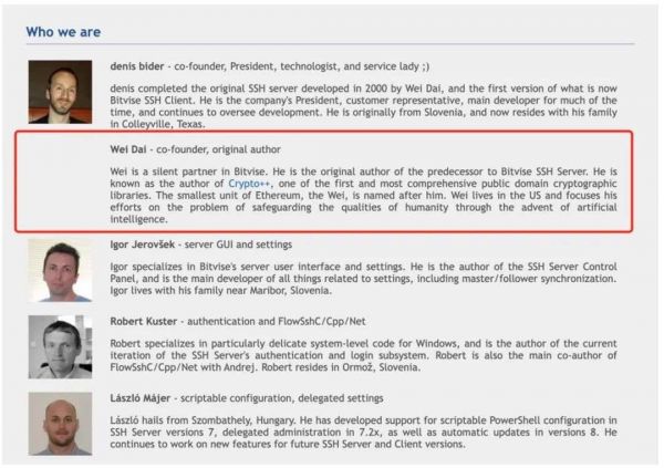 后来他从微软离职参与创立了有Windows最强ssh客户端之称的Bitvise,据说Bitvise软件第一版就是他写的。从Bitvise官网的创始团队介绍上,我们也能感受到Wei Dai究竟有多低调:不仅照片只有他的是一片空白,在介绍栏还专门强调了他是公司的“Silent Partner”。
