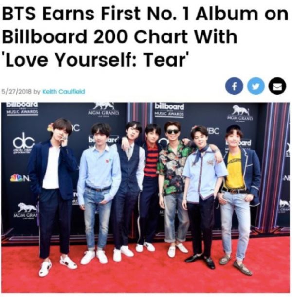 2018年5月, BTS的专辑《LOVE YOURSELF 轉'Tear'》,成为美国公告牌Billboard 200专辑排行榜冠军。图片来源:Billboard