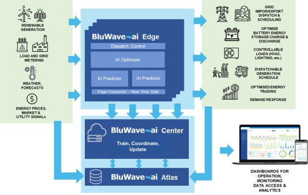 2021年,BluWave-ai和萨默赛德市合作开发了北美首个端到端AI优化电网,将能源网络转向最大限度地利用可再生能源,实现可再生能源的资产优化整合。2022年初,BluWave-ai正式启动加拿大智能电网AI卓越中心。这一中心由风电场、太阳能电池阵列、电池存储、电网连接、智能计量资产和基于云的人工智能优化平台等部分组成,为全球的国际客户提供技术支持。目前,AI卓越中心1.0版已全面运行,通过将萨默赛德市公用事业公司的分布式可再生能源和BluWave-ai基于云的边缘和中心平台相结合,推出各种智能电网软件产品,从实时采集原始数据到优化电网运行,在云端执行端到端的电网优化服务。其中BluWave-ai云平台由BluWave-ai Edge和BluWave-ai Center两个模块组成:BluWave-ai Edge主要包含服务协议等固定参数,以及可再生能源发电和电池充电状态等变量参数;BluWave-ai Center主要使用实时运营数据不断改进人工智能模型,以实现优化能源成本和其他运营目标。未来,加拿大和国际上第三方研究人员及实验室将能够访问和加载云平台的合成数据与人工智能模型。