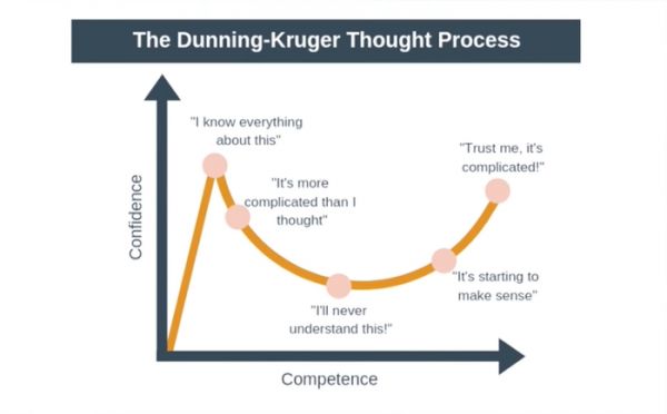 我们经常看到这样的情况,能力较低的人最终获得了成功。实际上,这是一种认知偏差,被称为“邓宁-克鲁格效应”。在一项任务中,能力较低的人会高估自己的能力。你对眼前的情况了解得越多,就越能意识到这些变量,以及它们是如何交织在一起的。