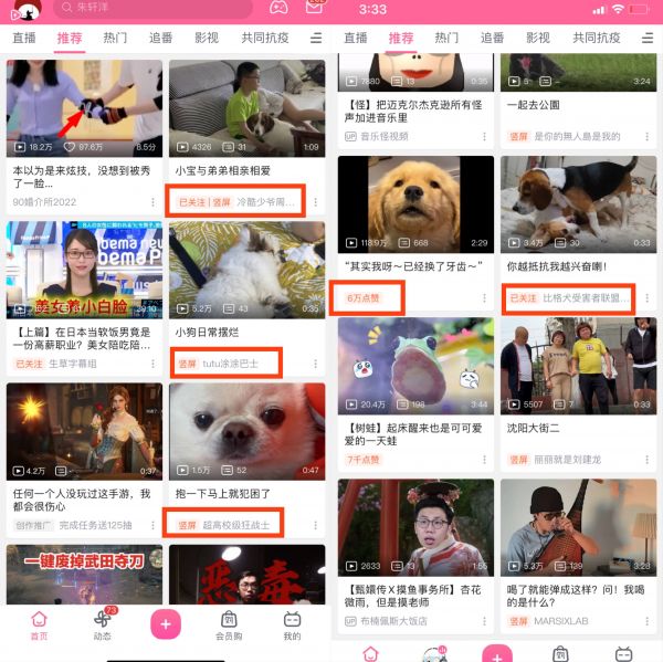 最近,B站在移动端首页为竖屏短视频设置了额外的醒目标识。以往这种橙色标识只会为“已关注”、“点赞飙升”等作品标注,相当于为部分视频提供了额外的推荐。如果一个 UP 主希望自己的作品能从用户首页的 8 个视频中脱颖而出,需要花大力气提升关注量和点赞量。