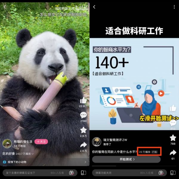 B站竖屏短视频信息流,右图为信息流中出现的广告