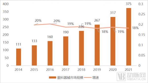 国内眼科器械市场需求大、增长快:随着青少年屈光不正患病率提高、中老年白内障手术量的增加,我国眼科器械市场规模增长迅速,由2014年的111亿元增长至2021年的375亿元,近五年的复合增速高达19%。
