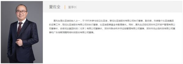 “其实当初我的想法是先协助王总做几年,然后回归老本行做投资。”夏佐全在投资界专访中曾这样评价在比亚迪的那几年生涯,“现在看自己在比亚迪工作的那段经历,给自己做投资带来了非常大的帮助。”