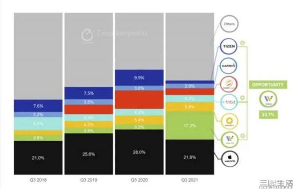 当然,站在谷歌的角度来看,似乎也没有在这一合作中“吃亏”。毕竟根据公开数据显示,自三星重回谷歌阵营后,“WearOS”在全球智能可穿戴设备市场中的占有率,短短一年时间里从长期不到4%暴增至超过17%,不仅摆脱了曾经“行将消失”的窘境,甚至一跃成为了业界第二。