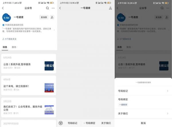 要体验这项功能,我们首先需要关注中国信息通信研究院旗下公众号“码号服务平台”,然后点击公众号的“服务”标签或是底部菜单,就可以看到“号码标记”和“号码绑定”两项基础服务。