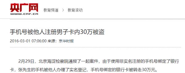 根据央广网报道,2016年初,北京海淀检察院通报了一起案件,海淀区居民张先生在并没有给手机号码办理实名登记的情况下,用该号码还绑定了银行卡以及支付宝、微信等账号,不想手机号码居然被别人办理了实名登记,而手机号绑定的银行卡账户里面的30万元更是不翼而飞。