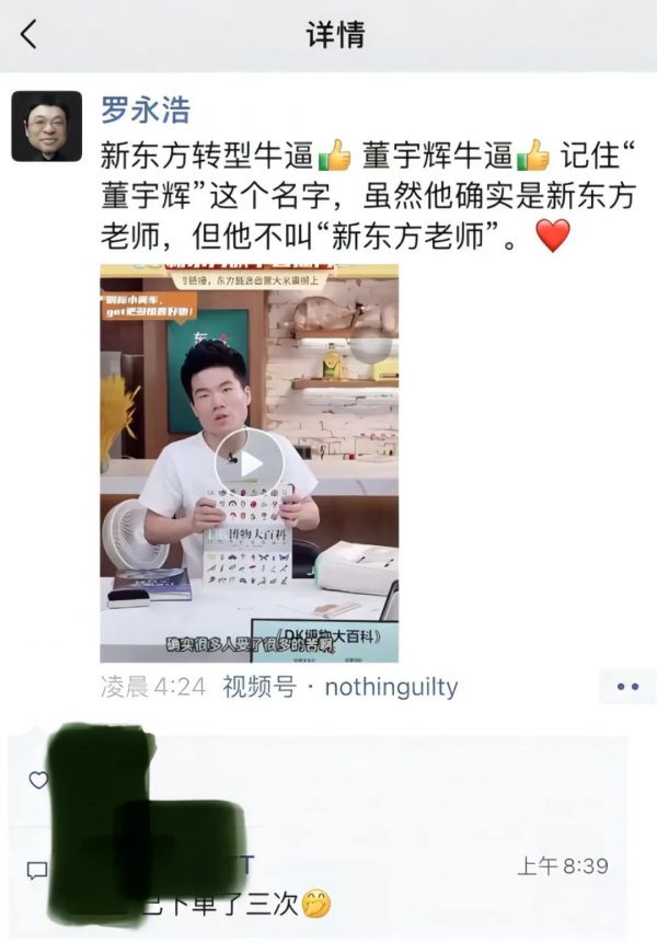 就连昔日的抖音大主播、古早时代的英语教师罗永浩,也在6月12日早上,专门发了一条朋友圈为新东方摇旗呐喊:“新东方转型牛逼,董宇辉牛逼。”