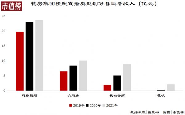 招股书中,花椒的收入既包括本身的音频和视频,也包括花吱(语音产品,提供群组语音聊天服务及播客等),其中花椒视频和六间房一样,增速缓慢,2021年几乎是原地踏步,重要的增长引擎是花吱和花椒的音频。