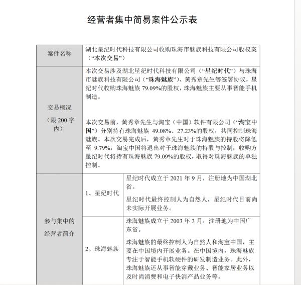 36氪获悉,6月13日下午,国家市场监督管理总局发布了湖北星际时代科技公司(星纪时代)收购珠海魅族科技悠闲公司的股权案件公示。根据公示信息,星际时代拟收购珠海魅族79.09%的股权,获得单独控制权。