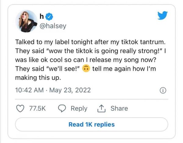 TikTok自从诞生以来,就一直以毁誉参半的名声活跃在欧美乐坛的各个角落。前段时间,Halsey(以下称猴西)在TikTok发布的一条吐槽视频,更是让其在欧美乐坛的名声天平再次出现了偏移。