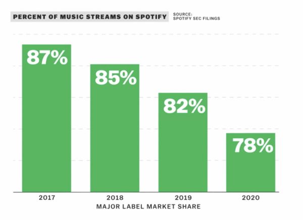 当这些TikTok出道的独立歌手们以绝对的数据优势刷榜时,唱片公司在音乐行业的收益终端——音乐平台上的收益以及地位都遭受到了重创。从Vox视频音乐流媒体公司Spotify招股书中的数据中也能看出,在Spotify上,大唱片公司的份额逐年下降。
