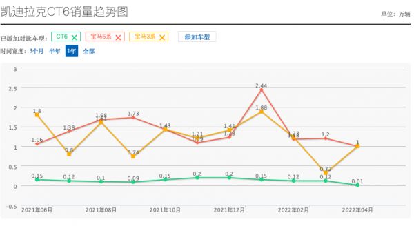 尽管打折力度较大,销量却不及同级别的宝马5系或者同价位的宝马3系。销量数据显示,CT6今年1月-4月累计销量4114辆,不到宝马5系单月销量的一半,宝马5系今年1月-4月共卖出58133辆。如果对比价格基本一致情况下的销量,宝马3系在今年前4个月卖出44301辆,约是CT6的十倍。