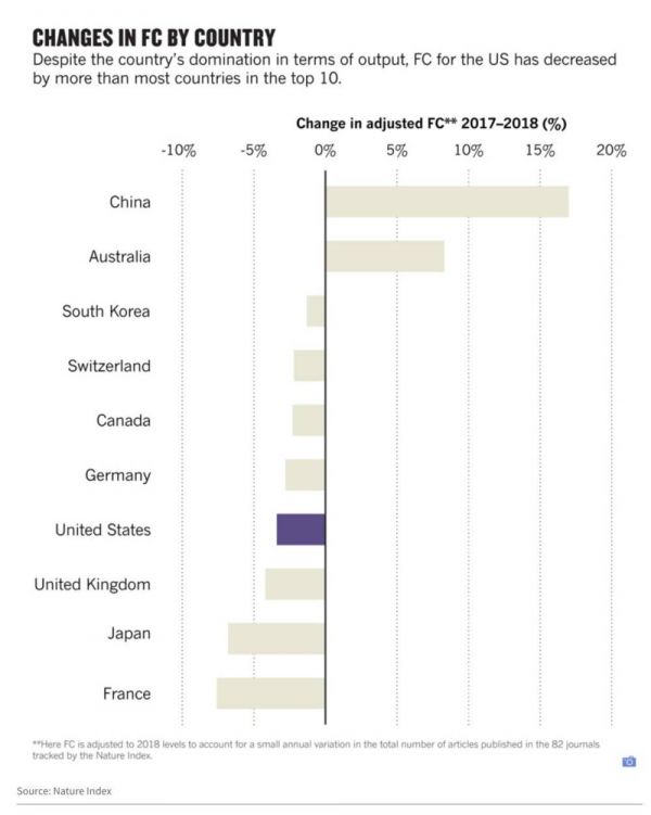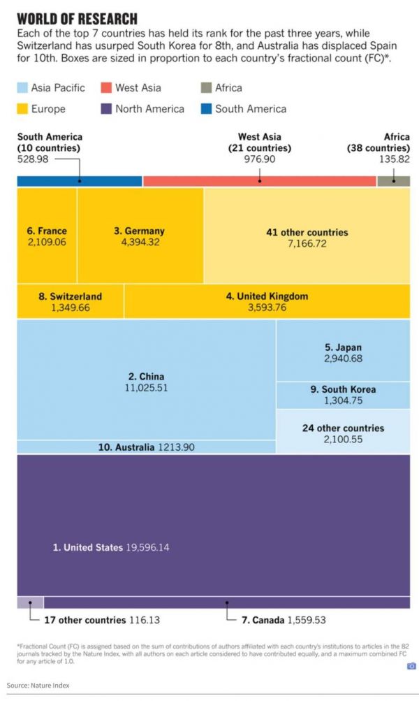 根据Nature官方发布的文章,其测量方法,即分数式计量(fractional count,FC)是基于发表在全球82种顶级期刊的文章份额,由独立的科学家小组选择并由自然指数数据库跟踪。