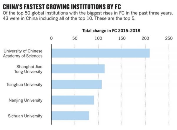 在过去三年里FC得分上升最多的全球50大机构中,42个是中国机构。