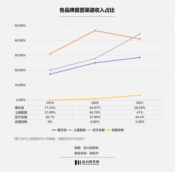 既然代理压货有风险,那就拓展直销渠道,把货直接卖给消费者。以天猫、京东等线上电商旗舰店为新阵地,巨子生物与敷尔佳近几年的直销渠道增长迅速:敷尔佳的线上直销收入3年翻了23倍,巨子生物在2021年靠直销卖了6.89亿,直销营收占比也提升到44.4%。