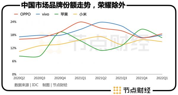 从2021年Q2开始,荣耀的市场份额逐渐回升。把范围拉长到2020年Q3-2022年Q1,荣耀的市场份额走出了一条V型曲线。