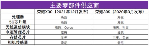 其中,荣耀X30中的大部分核心组件,如处理器、5G芯片组、电源管理芯片以及存储芯片,都是由高通、美光、Qorvo等美国制造商提供的。