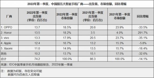 IDC数据显示,荣耀2022年Q1的市场份额为18.2%,是仅次于oppo的第二名。在2020年Q4-2022年Q1期间,荣耀是市场前五名中市场份额增幅最大的,达到13.6%,其次是小米,但小米的增幅只有1.2%。