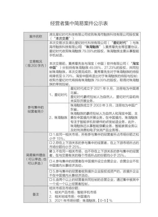 国家市场监督管理总局发布的公示文件显示,吉利旗下的湖北星纪时代已与魅族科技以及涉及交易的股东签署协议,星纪时代拟收购珠海魅族 79.09% 的股权。