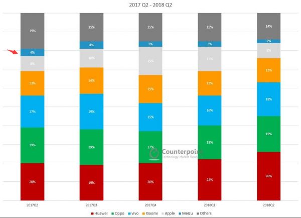 从那时起,魅族的命运或已注定。魅族的精品仍然足够精品,但放弃需求量巨大的入门机市场,就意味着回归小厂。从此魅族的份额便一路从全国前几跌到不足 1%,进入“投票没输过销量没赢过”的循环。