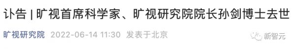 刚刚,旷视研究院发文,旷视首席科学家、旷视研究院院长孙剑博士去世。