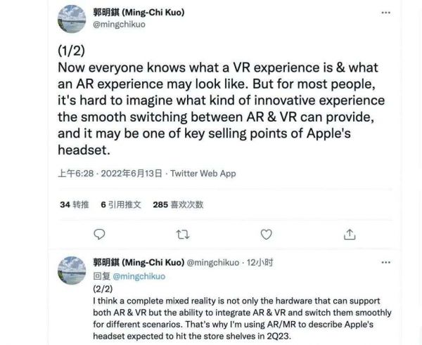 分析师郭明錤表示,苹果的混合现实头显设备,或许可以在可以在虚拟现实和(VR)增强现实(AR )模式之间轻松切换,并也有可能是这款头显设备的主要卖点之一。