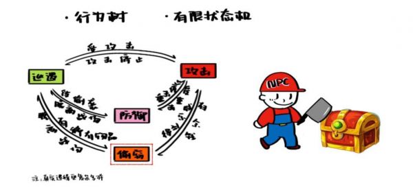 有限状态机像一个更松散的行为树,由有限个状态和执行条件组成。当 NPC 遭遇一定的条件,就会从当前状态转换到对应的另一种状态。
