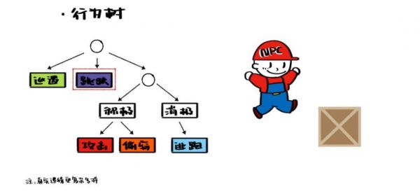 行为树是一大串如枝叶般扩散的指令,子结点包含了角色的执行前提和具体行为。当 NPC 需要行动时,就从根节点开始向下进行搜索,最终确定的子节点将是 NPC 做出的行为。