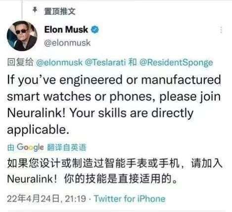今年4月,马斯克置顶了一条招聘手机专家的推文,为Neuralink脑机公司提供相关人才,让网友浮想联翩。