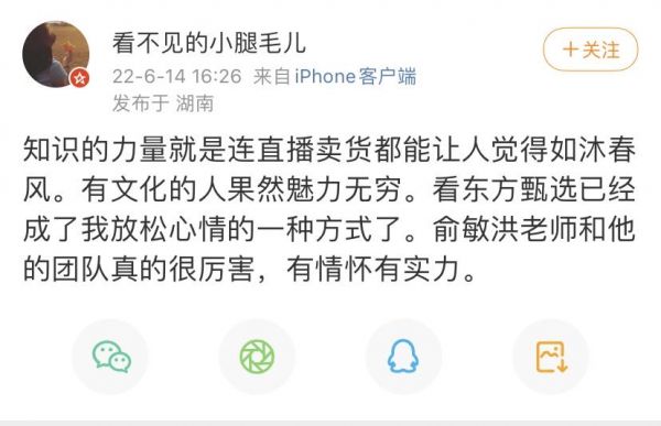 6 月 10 日,“新东方主播”词条冲上微博热搜,“从没想过能在带货直播间学英文”登上抖音热榜 TOP 1 。当晚,新东方董事长俞敏洪空降东方甄选,直播间同时观看人数达到 10.89 万人,单场涨粉 41 万。