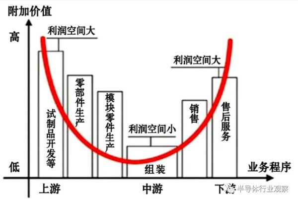 宏碁集团创办人施振荣在1992年提出了著名的“微笑曲线”,该曲线是一个微笑嘴型的图象,两端朝上的嘴角左端表示设计,右端表示销售。在产业链中,这两端的附加值高,而处于中间环节的组装制造,附加值最低。