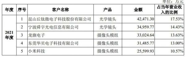 值得注意的是,2021年,在诚瑞光学的摄像头模组业务中,诚瑞光学向龙旗电子、华贝电子和小米科技销售摄像头模组的金额分别为3.3亿元、3.1亿元、2.56亿元,上述三家客户合计销售金额达9.01亿元。而诚瑞光学2021年全年的摄像头模组的销售额为9.1亿元,这三家客户几乎包揽了诚瑞光学当年的摄像头模组业务。