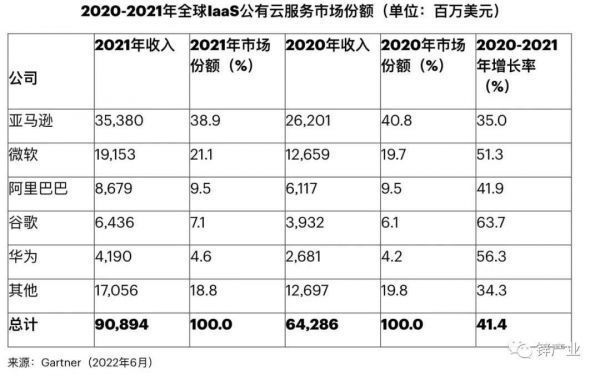 Gartner公布的统计数据显示,2021年全球IaaS公有云市场排名前三的依次为亚马逊(38.9%)、微软(21.1%)、阿里(9.5%)。