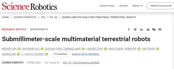 5月份的Science Robotics刊登了西北大学的一项研究,这项研究介绍了一款亚毫米级别的多材料陆地机器人。
