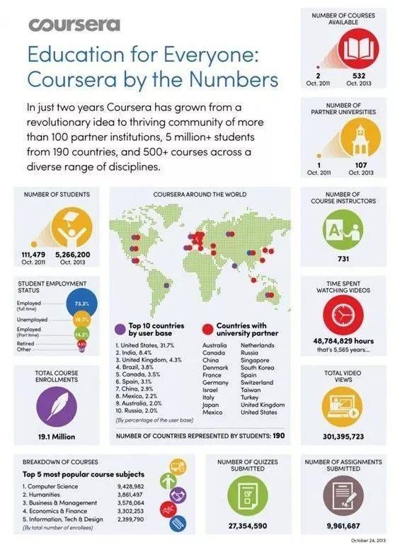 不过,当时的Coursera其实已经在全球化路上探索了很久。2013年B轮融资时,Coursera已经和四大洲的83个教育机构展开合作,为全世界400万名学生提供400门免费课程。