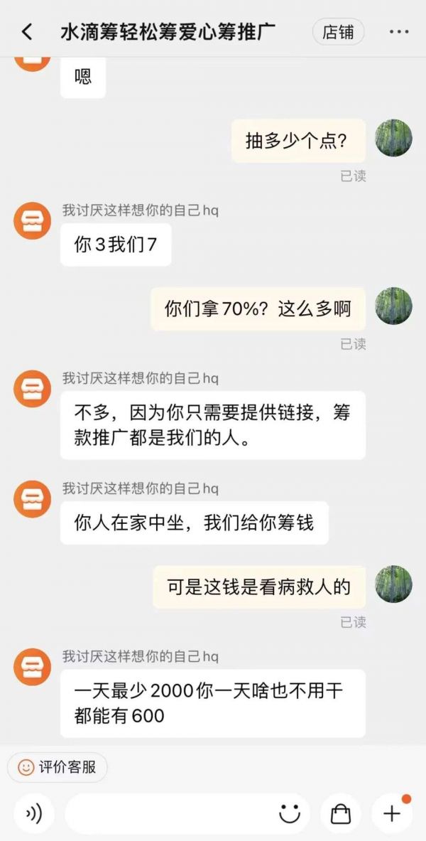 当被质疑抽佣比例过高时,对方的逻辑也是一套一套的:“你人在家中坐,我们给你筹钱,一天筹2000,你啥也不用干都能有600。”随后,这名卖家发来多张聊天截图,上面显示有的一天能筹集到3000多元,最多的一次筹集到50000元。