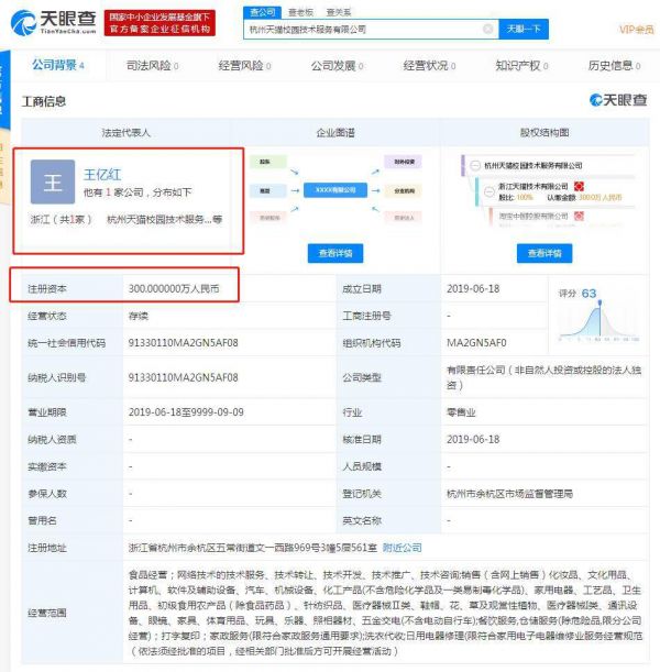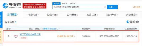 网易科技讯 6月20日消息,天眼查数据显示,2019年6月18日,浙江天猫技术有限公司100%投资成立子公司——杭州天猫校园技术服务有限公司,注册资本300万元,王亿红为法定代表人、执行董事兼总经理,张彧为监事。