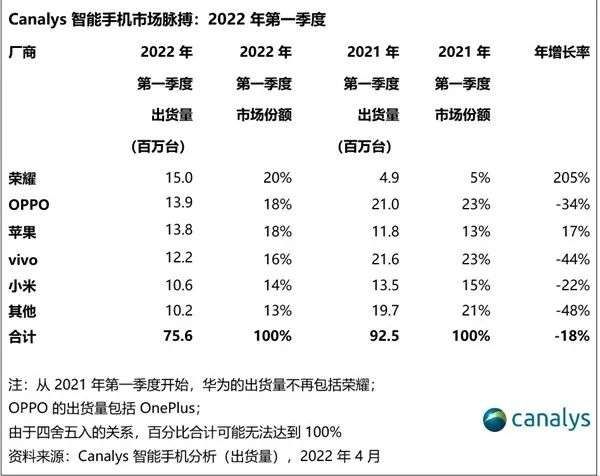据Canalys 发布的第一季度数据,除去年同期销售受限的荣耀实现同比增长,国内各家手机品牌厂商出货量皆出现下滑,其中vivo出货量下滑44%,OPPO下滑34%,小米下滑22%,仅苹果上升17%。