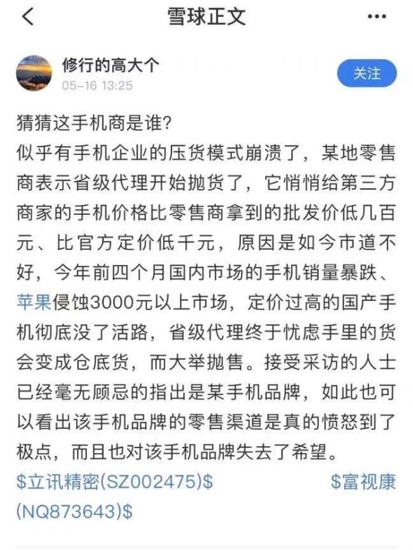 同时,围绕“压货”,一些声音也在网络上发酵。一名ID名为“修行的高大个”的雪球网友爆料,由于今年市场惨淡,某家厂商省级代理大举低价抛售存货,从而促使“压货”模式崩溃。