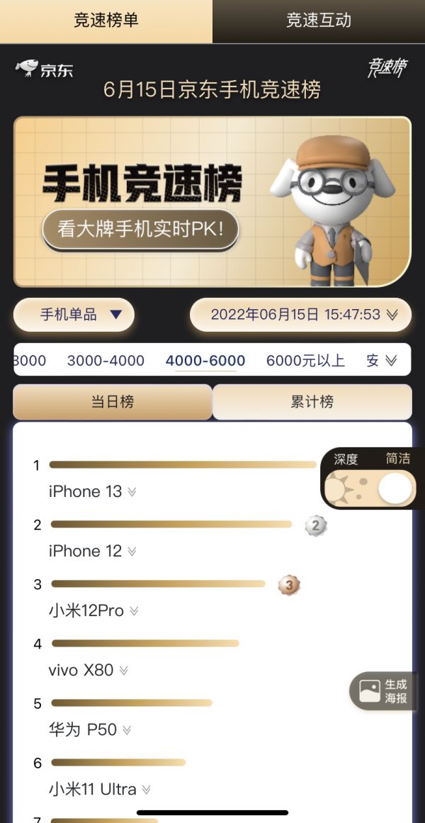 618正被苹果“霸榜”,6月15日,京东“618手机竞速榜”累计销售量榜首仍由iPhone13占据,“4000~6000元”以及“6000元以上”两个价格区间的前一二名分别为iPhone13、iPhone12以及iPhone13 Pro Max、iPhone13 Pro。